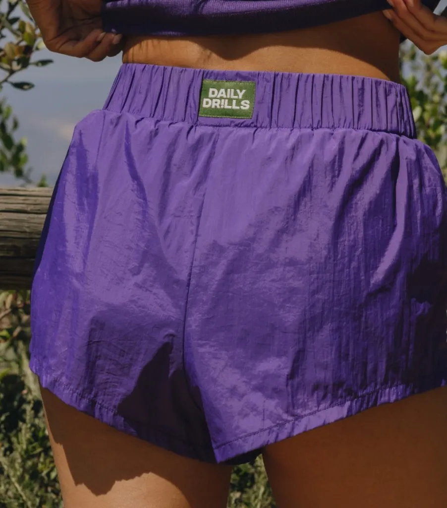 DAILY DRILLS HIGH WAIST SUPER BOUNCE SHORT IN PURPLE XL $64 like new built in underwear size XL not sold online, sold out everywhere waist 15-20” rise 12” inseam 2” color: purple size: Summer is 5'9 and wearing size XS/S body: 100% nylon preppy / varsity / collegiate