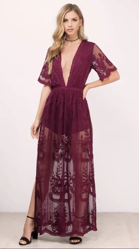 ✨ Best in Boutiques HP 7-26-22✨ Maroon wine red maxi dress with lace overlay Size S Lined until mi... Show more