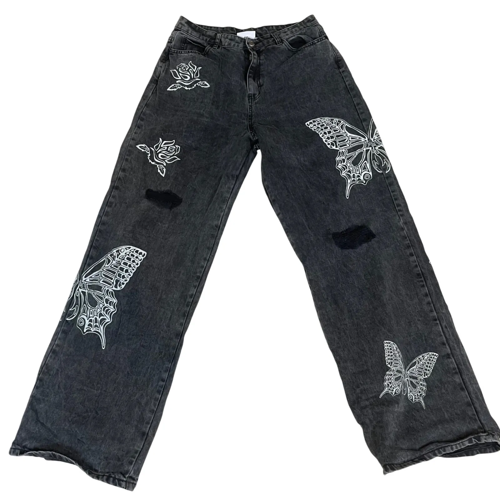 Black Wash Butterfly Rose Destructed Wide Leg Denim Pants Large HOT TOPIC pre owned see all approx measurements Bin 1 Pre owned see all approx measurement Black wash wide leg jeans with butterfly and rose embroidery. These statement jeans feature a distressed aesthetic with ripped details on the knees and a unique white embroidered design throughout. Material: Cotton Closure: Zip, Button Keywords: Daisy Street Jeans, Wide Leg Jeans, Embroidered Jeans, Butterfly Jeans, Rose Jeans, Distressed Jeans, Black Jeans, Womens Jeans, Denim Pants, Streetwear Fashion, Y2K Style, Alt Fashion, Graphic Jeans, Boho Chic Please see all approximate measurements. Please ask any questions before purchasing