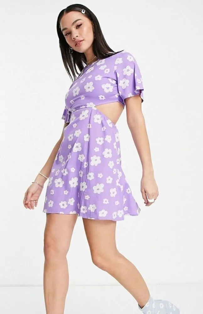 Daisy Street Lavender & White Floral Mini Dress with Cutouts, NWT. Size 14 or XL. Super cute! Care & content tags in photos. One button loop is unattached as shown in pictures. Sold by ASOS among others. Floral, spring, summer, Taylor Swift, Eras Tour, streetwear, cutout, mini, fun, playful