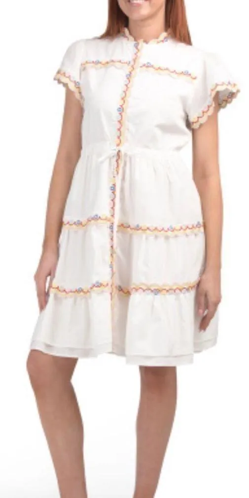 Item: DALIA MACPHEE Short Sleeve Scalloped Embroidered Dress With Tie Waist Size: Medium (M) Color/Pattern: Multicolor rainbow with embroidered applique design Material: Polyester and spandex blend – soft stretch fabric Condition: Brand New with Tags (NWT) This stunning DALIA MACPHEE embroidered dress is brand new with tags and features a vibrant rainbow pattern accented by elegant scalloped edges and a flattering drawstring tie waist. Designed with a tiered ruched skirt and flounce hem, this piece blends sophisticated structure with playful, feminine detail. The scallop neckline, short sleeves, and concealed front button placket offer a polished finish, while the fully lined construction ensures quality and comfort. Complete with a back zip and hook closure for a smooth, tailored fit. Features Short sleeves with scalloped edges Embroidered appliqué detailing Stretchy polyester/spandex fabric Drawstring waist with tie detail Tiered ruched skirt with flounce hem Concealed front button placket Seamed bodice and back zip closure Fully lined Machine washable Imported Style #: 4000373904 Approximate Measurements (laying flat) Shoulder to shoulder: 16 inches Bust (straight across): 14 inches Length: 43.5 inches