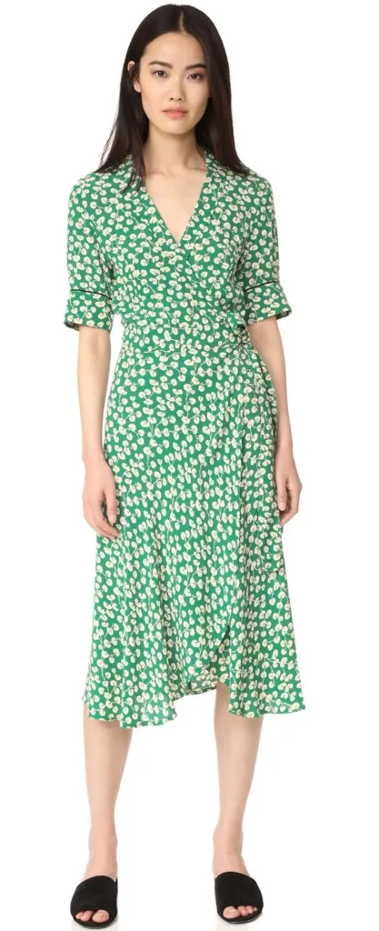Ganni Dalton Silk Crepe Wrap Dress in Green Floral Print Label reads Size L / Size Large but may fit more like a Size M / Size Medium // Measurements in photos Great condition! Sleeves have slight pull or discoloration (shown in photos). Dress has belt loop threads but belt is not present or included. 100% silk dress. Lined in cream polyester fabric. Aeffe Spa, made in italy.