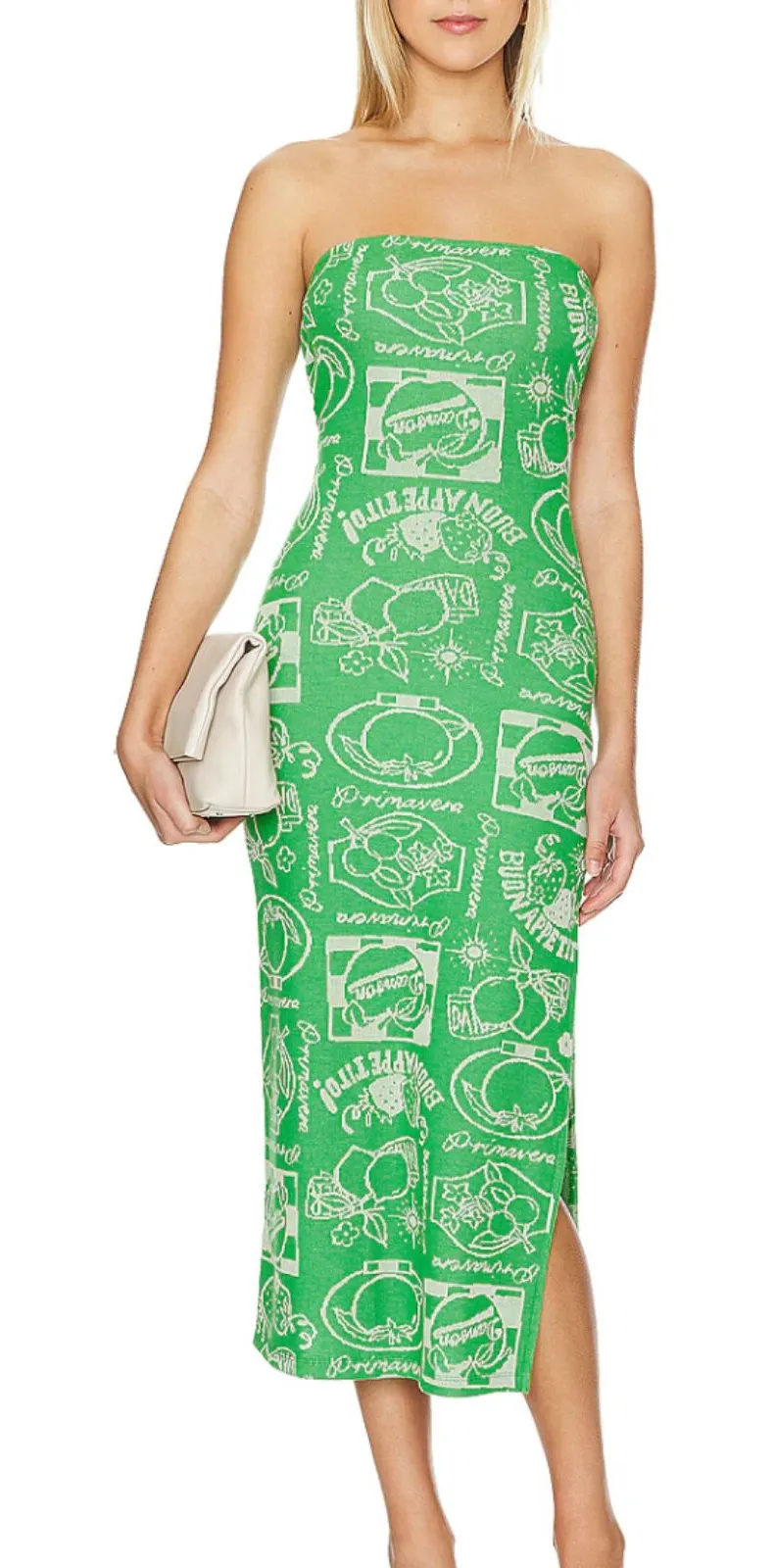 DAMSON MADDER Italian Jacquard Sleeveless Midi Dress Green Sz 8 Green strapless midi dress Italian fruit print throughout Tie back with opening Side slit Poly, viscose, elastane blend EXCELLENT PRELOVED CONDITION Size 8 15" pit to pit, 45.5" long