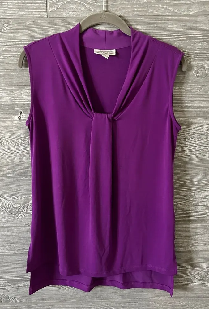 Elevate your wardrobe with this striking DANA BUCHMAN sleeveless top. The rich purple hue and elegant draped neckline create a sophisticated silhouette that flatters beautifully. Designed for effortless movement, the sleeveless cut and subtle side slits offer both comfort and chic versatility. Perfect for a business casual meeting or a stylish evening out. Type: Blouse Department: Women Style: Tunic Neckline: Cowl Neck Sleeve Length: Sleeveless Sleeve Type: Casual Sleeve Pattern: Solid Accents: Pleated Features: Keyhole Neck, Unlined Fit: Regular Fabric Type: Knit Occasion: Workwear, Business, Casual, Party/Cocktail Closure: Pullover Season: Summer, Spring Keywords: DANA BUCHMAN, sleeveless top, purple blouse, draped neckline, women's fashion, business casual, workwear, sophisticated, elegant top, versatile, knit top, pullover, petite