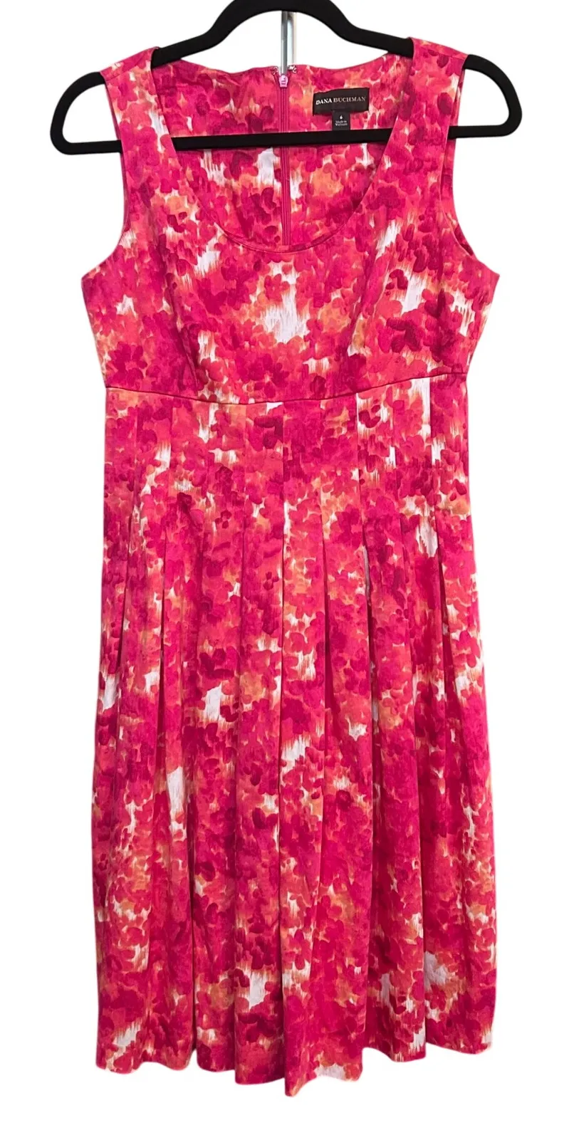 Excellent condition. Quality piece. A chic and vibrant floral print dress, perfect for adding a pop of color to your wardrobe. This sleeveless dress features a flattering scoop neckline and a fitted bodice that transitions into a pleated skirt, creating a classic and feminine silhouette. The dress is fully lined and has a concealed back zipper closure. Ideal for a garden party, a summer wedding, or a sophisticated brunch. Ask for measurements!