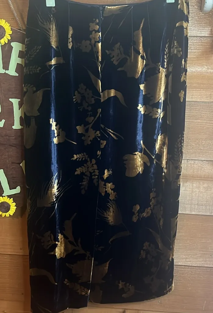 Brand: Dana Buchman (Luxe) Luxury Description: Silk blend perfect floral pattern beautiful velvet and so soft! Navy blue and golden. Hidden zipper and button closure. Internal waist band. Fully lined with a back slit. No flaws found! Next day shipping!! Measurements taken with the item laying flat Size 8 Waist 14” Length 31” Photos are taken under lighting which may cause a varient in color. Please understand every attempt is made to capture true and accurate color. If available, a stock photo may be provided in the photos. Tags: Silk designers floral midi maxi luxury velvet quiet lux business casual wedding party new year D1