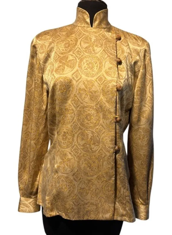 I love this gorgeous Gold Metallic print silk Top Jacket by Dana Buchman. Until Dana Buchman retired and the brand was acquired by Kohl's in 2008, "Dana Buchman" was a prestigious "gateway to couture" line, and this Top dates from that time. This particular Top dates back to the mid-1990s, hence its classic design. From my personal collection, in pristine condition. This vintage Dana Buchman blouse is a must-have for any fashion-forward woman. The Gold Metallic print and design make it a statement piece that is sure to turn heads. The long sleeves and offset front button add a touch of sophistication with removable shoulder pads, while the silk material ensures luxury and comfort. This blouse is perfect for a night out on the town or a day at the office. The size 4 fits regular and the blouse is categorized under tops, women's clothing, women, and clothing, shoes & accessories. Dana Buchman Size 4 100% silk measurements flat, 1 way unstretched +-19.5" armpit to armpit +-16" waist area +-25" long smoke free home