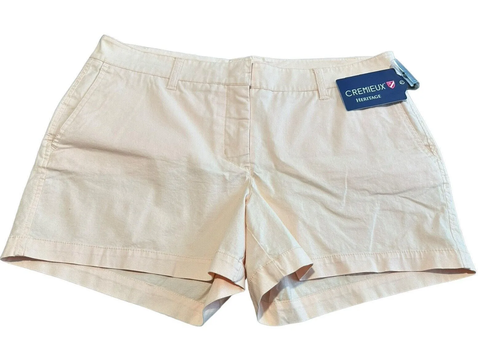 Elevate your wardrobe with these stylish Cremieux women's shorts in a beautiful peach color. These shorts are perfect for any occasion, whether you're traveling or just having a casual day out. Made from a comfortable cotton blend fabric with a lightweight feel, they are perfect for walking, going to the beach, or even typing emails. Featuring a flat front design and a mid-rise fit, these chino style shorts are classic and versatile. With a 4-inch inseam, they are perfect for any height. The button accents add a touch of elegance, making them suitable for both designer and colorful themed outfits. Made in China, these shorts are a must-have addition to any fashion-forward woman's wardrobe.