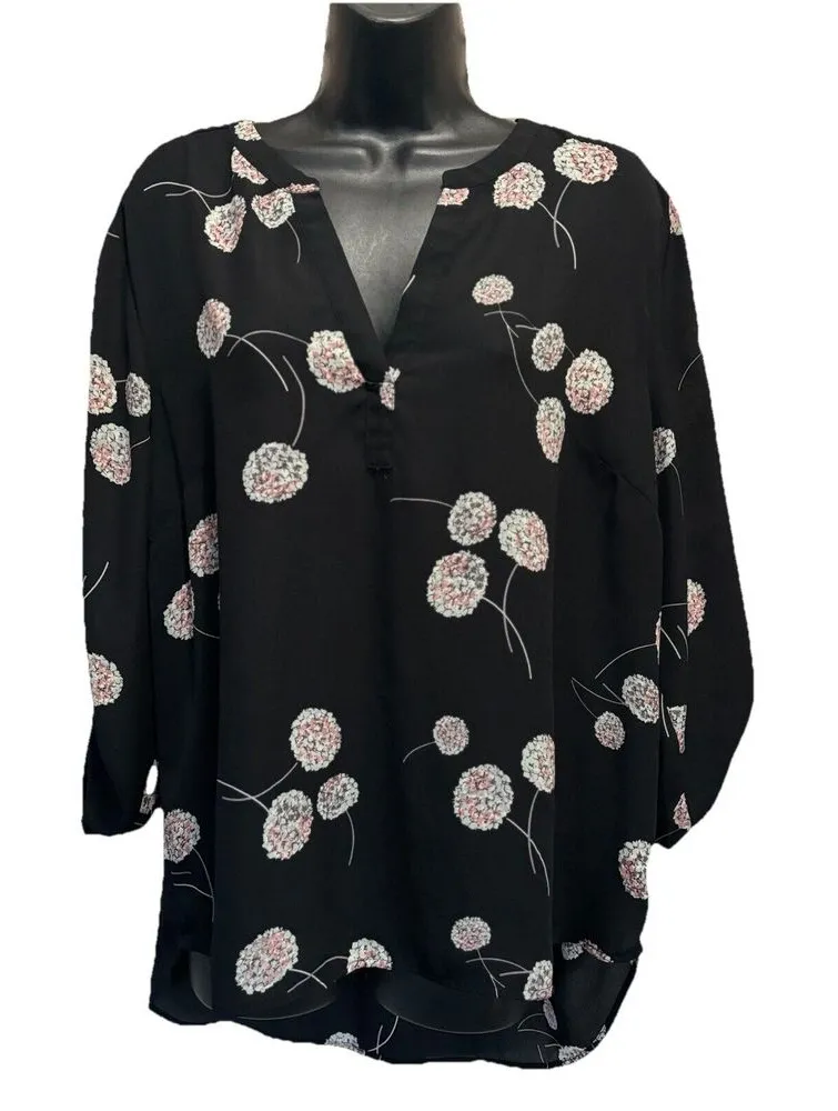 Elevate your wardrobe with this stunning Daniel Rainn blouse. The black, gray, and pink floral pattern is perfect for any occasion, whether it be travel, casual, workwear, or career. The chiffon material and 3/4 roll tab sleeves add a touch of bohemian and floral charm to your outfit. This high-low blouse is also versatile for all seasons, including winter, summer, fall, and spring. It is 22" pit to pit and has a length of 26"-30". Carefully crafted with polyester, this machine washable blouse features a V-neckline and pullover closure for easy wear. The blouse is also lightweight, breathable, and has a slimming effect. This petite size PXL blouse is perfect for women who want to look stylish and put together without compromising on comfort. (1681)
