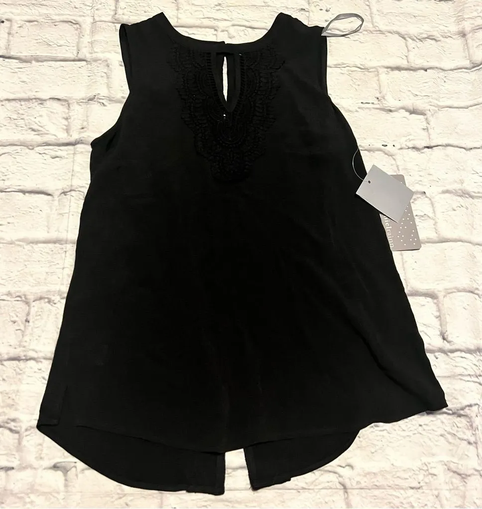 A chic and versatile black tank top from Daniel Rainn. This sleeveless blouse features a delicate lace trim down the front, adding a touch of elegance to its casual design. The keyhole back adds a subtle detail. Perfect for a relaxed day out or dressed up for a casual evening, this tank top is a stylish addition to any wardrobe. Ideal for brunch with friends or a casual date night. Keywords: Daniel Rainn, tank top, sleeveless top, lace trim, black blouse, casual top, women's top, XS, extra small, blouse, summer top, dressy casual, keyhole back