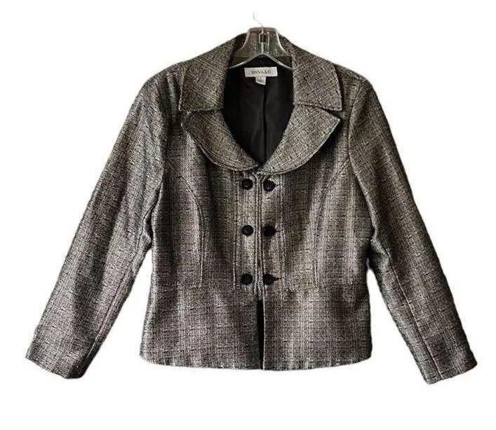 Danillo Jacket and matching Skirt Set. Silver and Black. Jacket double Breasted Style. Notched collar. Button up front. Half belt back. Slightly padded shoulders. 100% polyester. Size 12. Skirt is lined. Back zipper. Waist approx. 17”flat lay. Hips approx. 21” flat lay. Length 25”. Great condition.