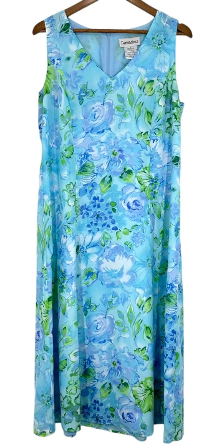 Vintage Danny & Nicole 90s Floral Maxi Dress V Neck Sleeveless Blue Green Womens Size 16 Pre-Owned in Good Condition - Some minor pulling at a seam on the back - Please see Pictures Approximate Measurements: Length: 48" Pit-Pit: 20" Waist Flat Lay: 16" Embrace effortless elegance with this enchanting Danny & Nicole floral maxi dress. Its airy silhouette and vibrant blue and green floral print evoke the feeling of a serene garden stroll, making you feel as beautiful as the blossoms themselves. The flattering V-neckline and sleeveless design offer a graceful silhouette, perfect for warmer days. This dress is an ideal choice for a charming garden party, a delightful brunch with friends, or a relaxed summer vacation. Measurements: • Pit to Pit: 21 in • Waist: 42 in • Length (Shoulder to Hem): 52 in
