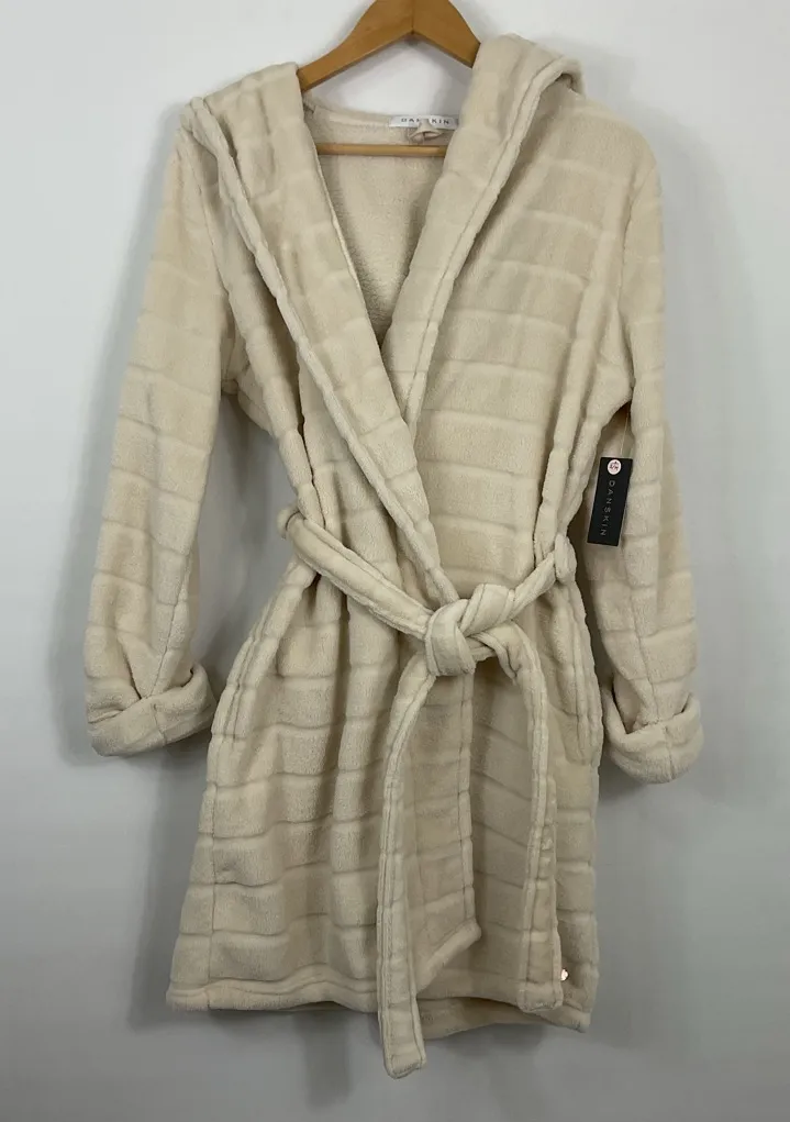 Danskin Hooded Plush Robe. Womens Size S/M. The color is dune dust. Still has tags. 100% Polyester.... Show more