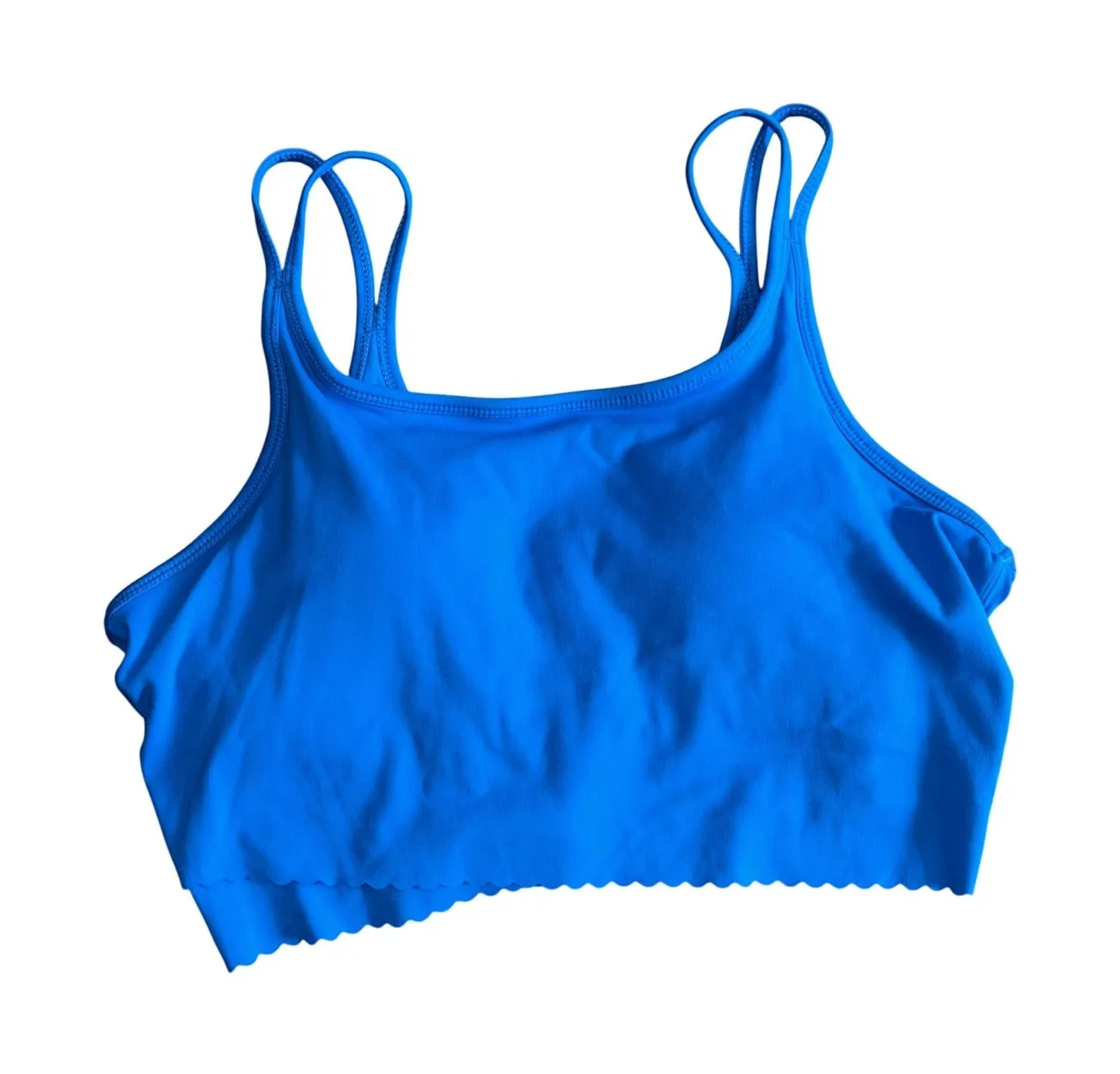Keywords: Danskin, crop top, tank top, sports bra, scallop hem, moisture wicking, 4-way stretch, activewear, workout top, yoga top, palace blue, medium, exercise, fitness