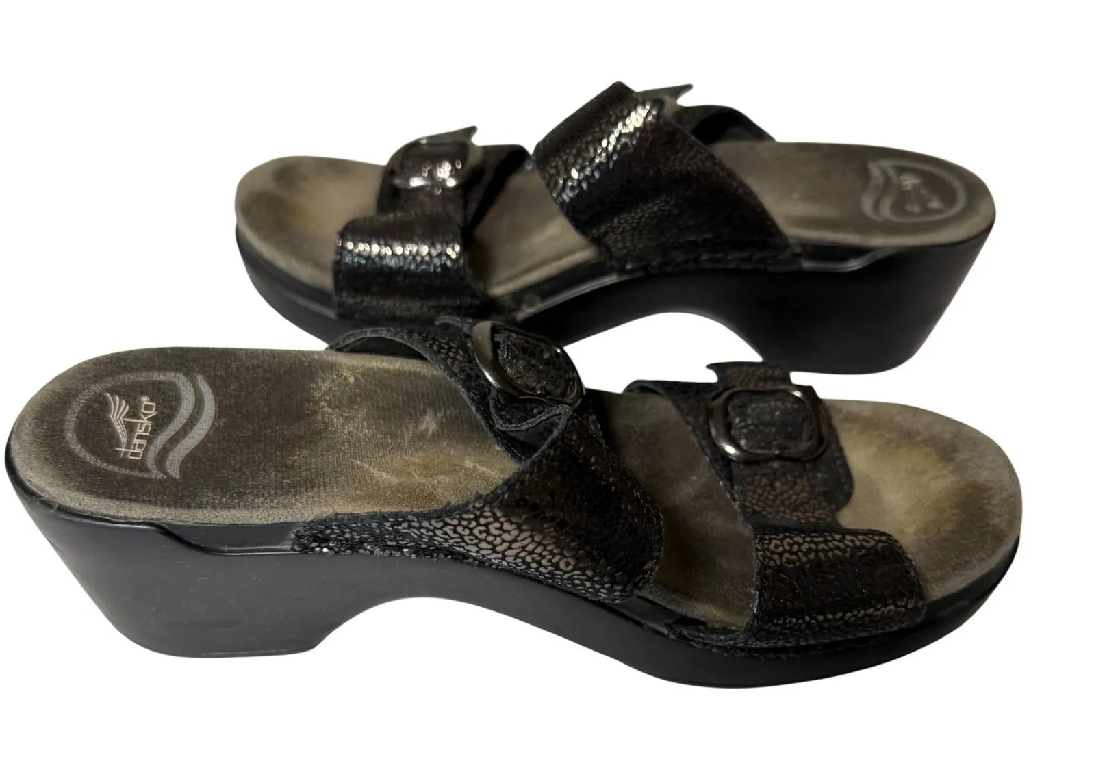 Step into stylish comfort with these Dansko wedge sandals. Adorned with a shimmering metallic textured finish in a rich black and bronze hue, these sandals feature two adjustable buckle straps for a personalized and secure fit. The contoured footbed and supportive wedge heel offer all-day comfort, making them perfect for strolling through the city, enjoying a casual brunch, or a relaxing vacation. Style: Slide Department: Women Upper Material: Leather UK Shoe Size: 6.5 AU Shoe Size: 8.5 Heel Style: Wedge EU Shoe Size: 40 Features: Straps, Adjustable Strap, Buckle, Comfort Closure: Buckle Pattern: Flecked Accents: Buckle, Glitter Heel Height: Mid (2-2.9 in) Type: Sandal Product Line: Dansko Keywords: Dansko, women's sandals, metallic sandals, wedge heels, buckle sandals, black sandals, bronze sandals, comfort shoes, casual sandals, summer shoes, European size 40, statement shoes, fashion sandals