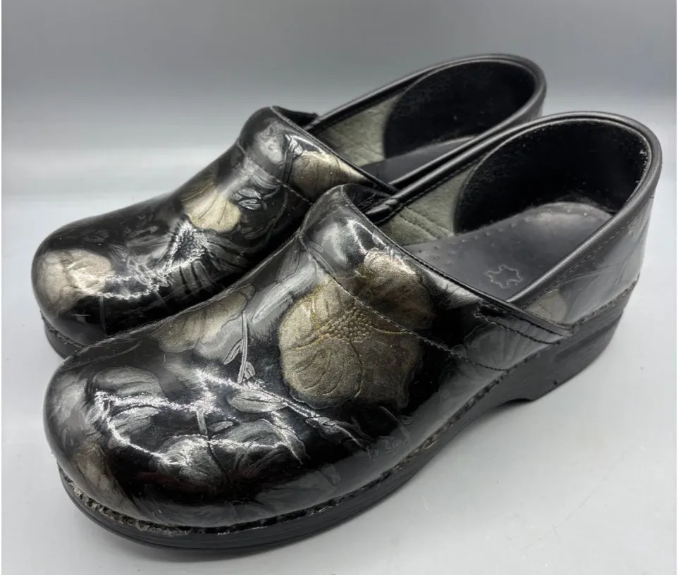 Comfortable clogs designed with embossed floral leather, offering style and durability for daily wear. Slip-resistant and ideal for long hours. • Durable leather upper with embossed floral pattern • Slip-resistant sole for stability • Cushioned insole for added comfort • Closed-back design for secure fit • Lightweight and supportive construction Some wear on soles from use. SHIPPING DISCOUNT: Take advantage of combined shipping with a bundle of two or more items from my closet. Simply add two or more items to your bundle, and the discount will be applied automatically during checkout!
