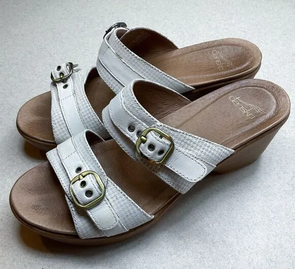 Dansko Jessie Sandal White with cream and white houndstooth design Double brass buckle adjustable straps ABSOLUTELY PERFECT CONDITION Size 39 (8.5-9) Zero flaws Style # 9700122200 Width Width Medium Department Women's Sandal Style Slide Material Genuine Leather, Genuine Suede Heel Style Wedge Platform Yes All items come from a smoke free, pet free home, authenticity guaranteed #1247/8/21/24
