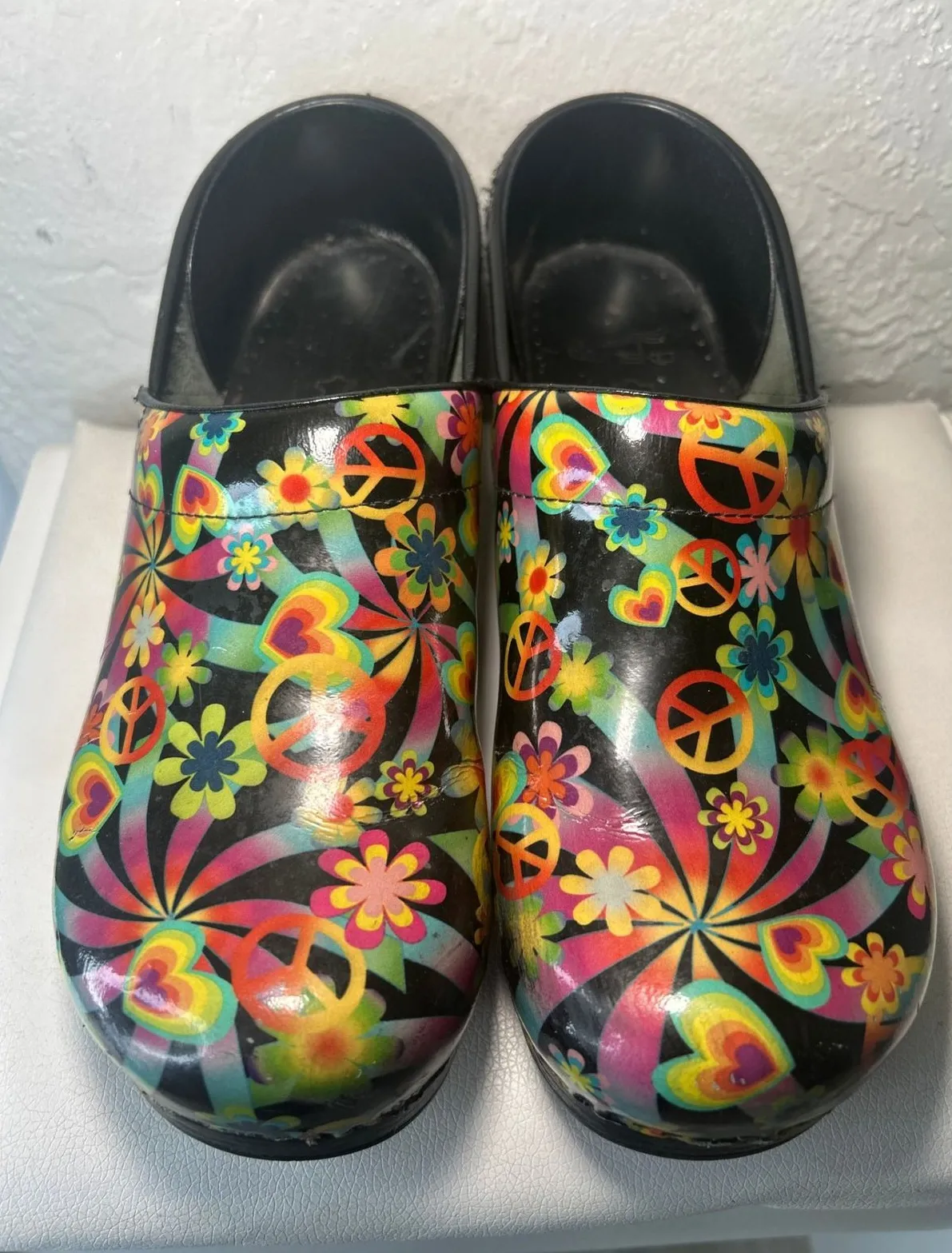 Dansko vibrant clogs showcasing a playful paisley floral and peace sign print on a black background. Size 41 which equals US size 10.5 / 11 The slip-on design ensures effortless wear, and the sturdy construction offers reliable support. Some minor peeling and scuffing to exterior as shown. Plenty of life left in them. See pictures for exact condition status, ask questions as needed. Style: Clog Upper Material: Synthetic Lining Material: Leather Insole Material: Leather Pattern: Floral Closure: Slip On Shoe Width: Standard Features: Comfort, Cushioned, Arch Support, Non-Slip, Slip Resistant Heel Height: Mid (2-2.9 in) Keywords: Dansko clogs, paisley print, floral shoes, peace sign, nurses shoes, comfort shoes, slip on, groovy, retro, work shoes, casual, bright, whimsical