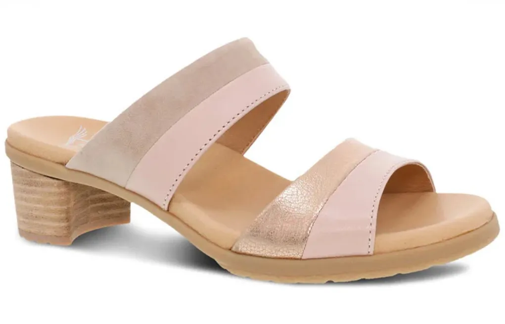 . Genuine leather & suede upper, slip on, wide straps, open toe, chunky block heel, rubber soles with great tread. Excellent condition. Spring Summer Comfort Comfortable Shoes Casual Neutral Pink Tan Neutral Metallic