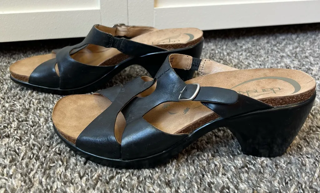 Dansko Women’s Black Leather Kai Strappy Wedge Sandals -Size 9.5-10 / EU 40 — please refer to last photo for Dansko size chart. The shoes are an EU 40 which is a 9.5-10 in US -black strappy design -leather sandals -Slip in In gently used pre owned condition. Has minor wear, markings and spots throughout, but in great condition overall! Please see all photos of condition. From a smoke free home. fall, summer, spring shoe shoes sandals sandal travel vacation honeymoon casual dressy classy comfortable comfort autumn trendy style stylish resort wear cai mule clog heel