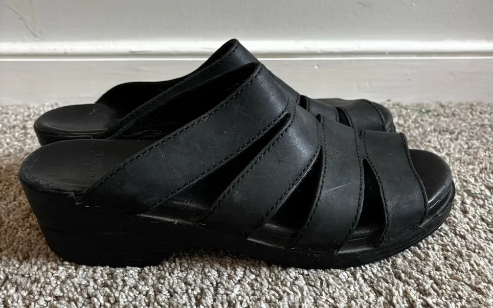 Good Preloved condition Dansko Women's sandals Black leather Slide sandals Comfort footwear Casual shoes Arch support Slip-on sandals Durable sandals Adjustable straps Size 10.5-11 US / 41 EU Orthopedic shoes Slip-resistant Lightweight shoes Footwear for all-day wear