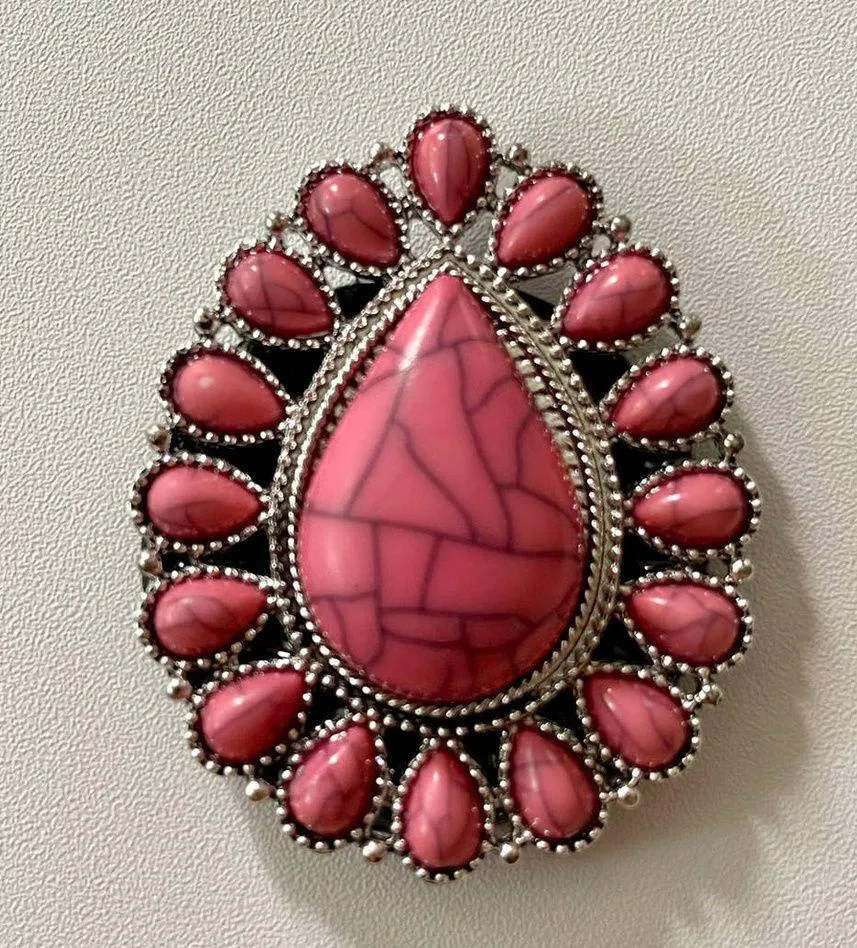 Pear shaped manufactured dark pink color turquoise western style handmade concho bag charm. Magneti... Show more
