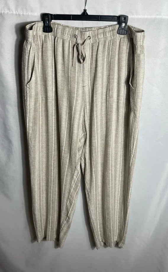 Stay cool and stylish in these lightweight Dash linen-blend striped pants. Designed with a relaxed fit, they feature a comfortable elastic waistband with drawstring tie, side pockets, and back patch pockets. The neutral beige tone with subtle vertical stripes makes them versatile for pairing with tees, tanks, or blouses. Perfect for casual wear, summer outings, or lounging in breathable comfort. • Brand: Dash • Size: XL (see measurements) • Color: Beige with vertical white stripes • Material: 55% Linen, 45% Rayon • Waist: Approx. 17.5” across (unstretched, flat) • Inseam: Approx. 28.5” • Rise: Approx. 12” • Leg opening: Approx. 6.25” across • Features: Drawstring waist, elastic waistband, side pockets, back patch pockets • Style: Relaxed casual pants • Condition: Pre-owned, excellent condition #LinenPants #DashClothing #SummerStyle #CasualComfort #ResortWear