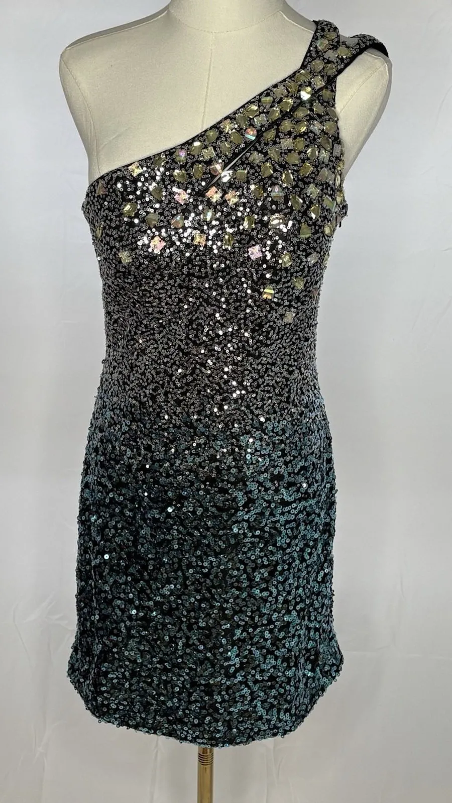 Turn heads in this stunning Dave & Johnny sequin cocktail dress. Known for bold, glamorous junior styles, Dave & Johnny dresses are popular for parties, homecoming events, and special occasions. This dress features a dramatic one-shoulder silhouette, heavy sequin and gem embellishment, and a fitted bodycon shape that sparkles beautifully under the light. Fully lined for comfort with a back zipper closure for easy wear. Details: • Brand: Dave & Johnny • Size: Juniors 9/10 • Color: Black with blue ombré sequin detail • Style: One-shoulder, bodycon • Closure: Back zipper • Fully lined • Stretchy fit • Condition: Excellent pre-owned condition with no missing sequins noted 📏 Measurements (laid flat, approximate): • Bust: 18 • Hips: 32 • Length: 18 ✨ Ideal for cocktail parties, homecoming, holiday events, New Year's Eve, pageants, or a night out. 📦 Ships fast and securely. 📸 Please see photos of the actual item for details and condition.