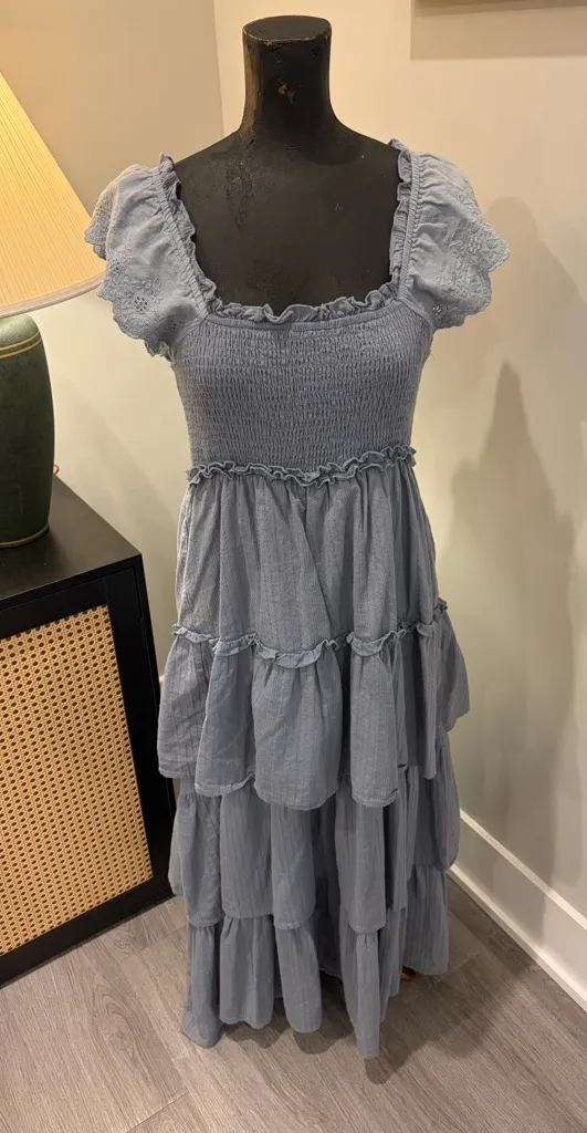 Dreamy, romantic, and effortlessly feminine, this DAVI & DANI pastel blue maxi dress is perfect for weddings, parties, and ethereal everyday moments. With its soft cotton fabric and flowing tiered silhouette, it fits beautifully into soft girl, fairycore, and coastal aesthetics. Details: • Brand: Davi & Dani • Size: Medium • Color: Pastel blue • Style: Soft girl / Fairycore / Ethereal / Coastal • 100% cotton shell with polyester lining • Eyelet cap sleeves with delicate detailing • Smocked bodice for a flattering, comfortable fit • Flowing tiered maxi skirt • Perfect for weddings, parties, showers, beach events, and garden occasions Condition & Notes: • Good preowned condition • Sold as found • Measurements are shown in the photos • Ships fast from a smoke-free home A beautiful statement dress that photographs wonderfully and feels just as magical in person.