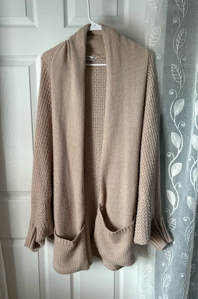 , cotton blend, size tag been cut, probably fit XL, pre-owned good condition Elegant cardigan with open-front design. Features cozy pockets and textured knit. Ideal for layering.