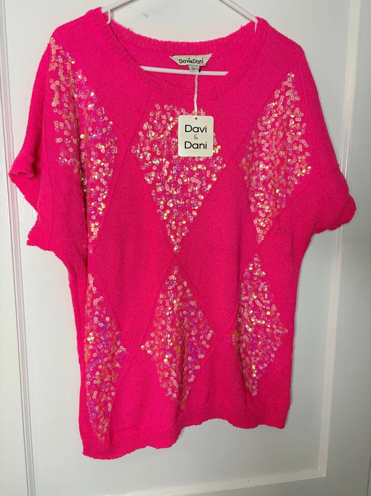 Pit to pit 27" Length 28" Style: Pullover Department: Women Material: Polyester, Acrylic Neckline: Round Neck Theme: 80s, Colorful Sleeve Length: Short Sleeve Type: Sweater Features: Oversized Pattern: Geometric Sleeve Type: Cap Sleeve Fabric Type: Knit Accents: Sequin Season: Spring, Summer, Fall, Winter Fit: Relaxed Keywords: pink sweater, sequin top, diamond pattern, knitwear, short sleeve, sparkly, glamorous, party wear, evening top, statement piece, unique knit, festive, bold color FF/498