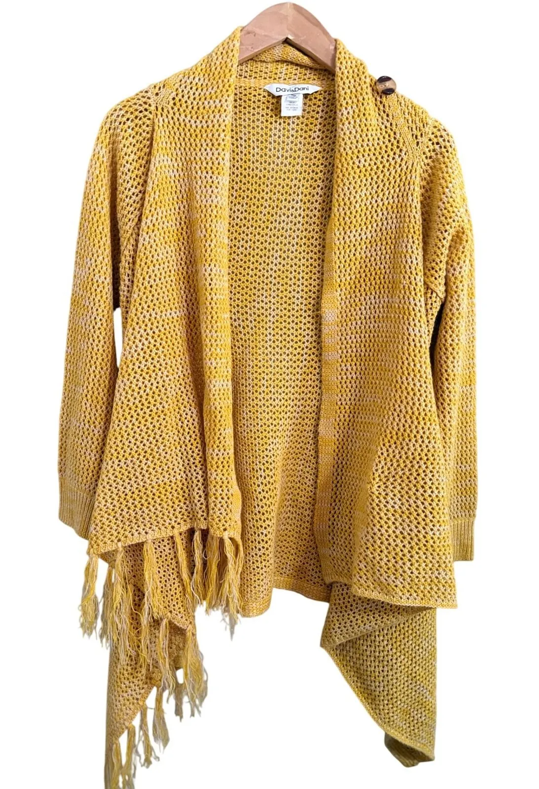 Wrap yourself in the sunny embrace of this Davi & Dani knit cardigan. Its open-weave construction creates a beautifully textured silhouette, while the cascading fringe adds a touch of playful movement that dances with every step. The vibrant yellow hue evokes feelings of warmth and cheer, making it a perfect layering piece to brighten any ensemble. Ideal for a casual day out, a breezy evening stroll, or adding a bohemian flair to your vacation wardrobe. Style: Cardigan Department: Women Material: Acrylic Neckline: Open Neck Theme: Bohemian Type: Sweater Sleeve Length: Long Sleeve Features: Open, Breathable Pattern: Geometric Sleeve Type: Dolman Sleeve Fabric Type: Knit Accents: Fringe, Tasseled Keywords: knit cardigan, fringe detail, waterfall cardigan, yellow sweater, open knit, boho style, lightweight, duster cardigan, shawl collar, women's fashion, casual wear, spring fashion, summer evenings