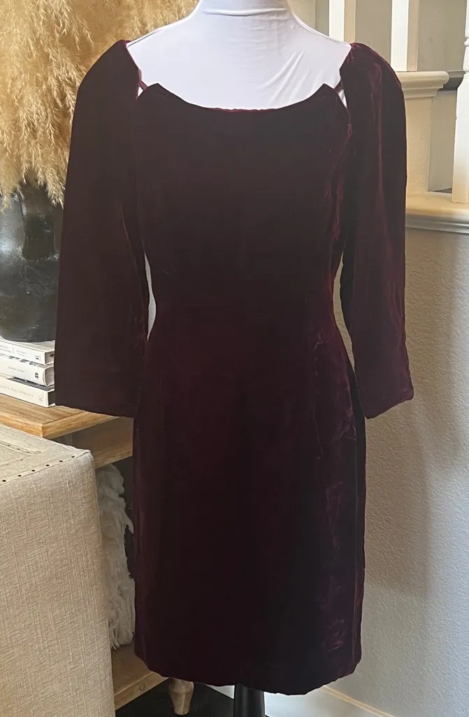 Elegant and timeless David Fielden vintage velvet dress in a rich burgundy hue. Features a flattering square neckline, three-quarter sleeves, and a fitted silhouette that highlights the waist. Crafted from luxurious soft velvet with a fully lined interior for comfort and structure. Perfect for formal events, evening gatherings, or holiday occasions. Bust 38” Waist 16” Length 36” Details: • Brand: David Fielden • Size: 12 • Color: Burgundy / Wine • Material: Velvet • Three-quarter sleeves • Square neckline • Zip back closure • Vintage design — rare find holiday party dress • evening cocktail dress • luxury designer dress • vintage occasion dress • 90s velvet dress • timeless classic dress •. vintage formalwear • winter wedding guest dress • romantic vintage style • Christmas cocktail dress • New Year’s Eve dress