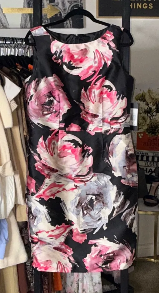 So good 🖤 Brand new with tags! Size 12. Features: Elegant David Meister sheath dress featuring a painterly floral print set against a deep black background. Designed with a tailored, body-skimming silhouette that flatters through the waist and hips, this sleeveless style delivers a polished, occasion-ready look without feeling overdone. The structured fabric provides a smooth, sculpted finish, making it ideal for cocktail events, formal dinners, weddings, or elevated evening occasions. Timeless yet statement-making, this is a sophisticated piece that transitions effortlessly from professional to evening wear. Material: 100% Polyester Approx. Measurements: - Bust: 38 inch - Waist: 34 inch - Hip: 41 inch - Length: 40.5 inch Style Aesthetic: modern feminine elegance, refined cocktail dressing, painterly floral statement, tailored sheath silhouette, polished eveningwear, classic with a modern edge, elevated occasion style, romantic sophistication, timeless formal dressing, chic event-ready look