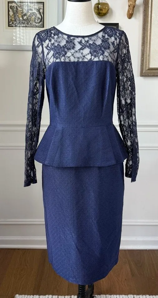 David Meister dark blue long sleeve peplum waist cocktail dress. Back zip closure with illusion lace... Show more
