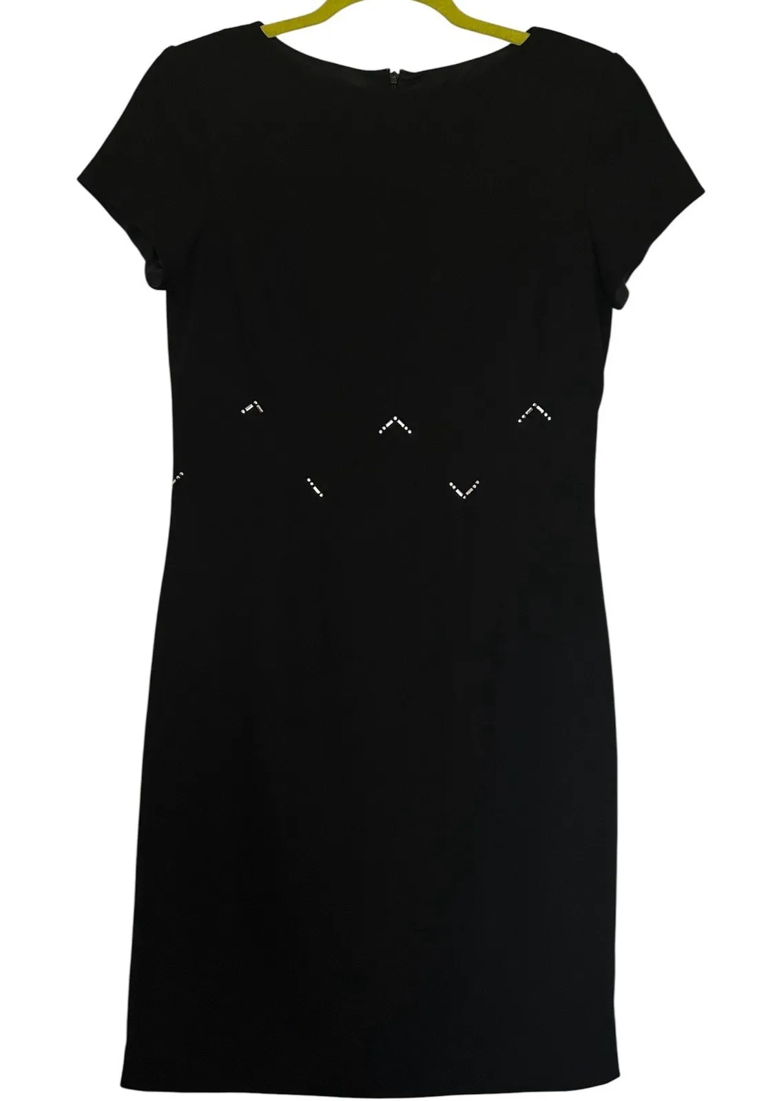 The David Warren New York Size 6 Black Short Sleeve Dress is a stylish and versatile piece perfect for various occasions such as parties, formal events, workwear, or business meetings. The dress features a silver waist accent that adds a touch of elegance and vintage charm. Made of polyester with a solid black color and a knee-length sheath style, this dress is easy to care for with hand wash only. It has a round neck, zip closure, and is ideal for summer, fall, and spring seasons. Perfect for a woman looking for a sophisticated yet trendy outfit with a metal theme. Pit to pit 18" Waist 31" Length 36.5" Bin M