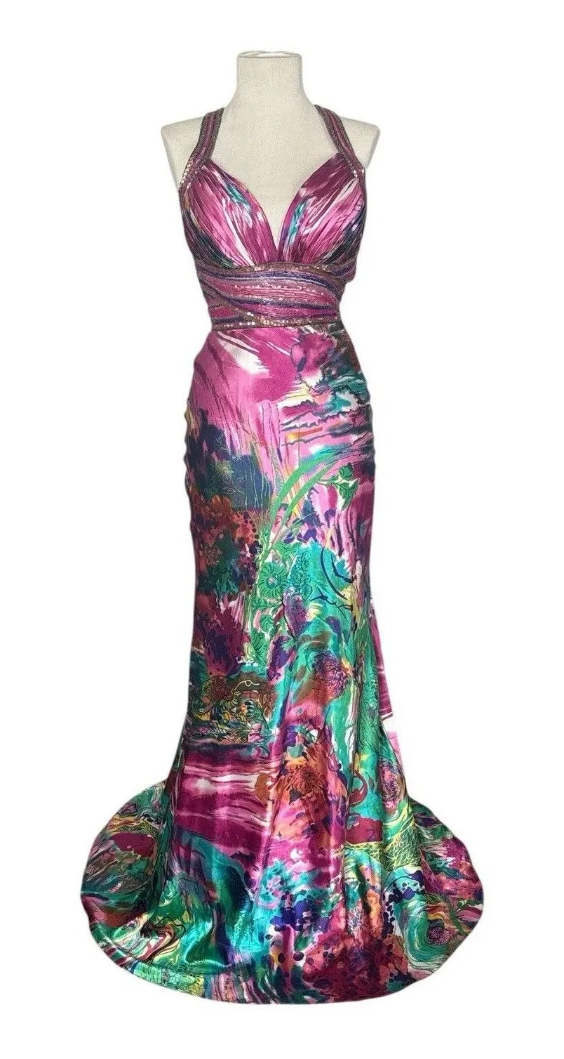 The product is a David's Bridal Pink Floral Watercolor Mermaid Prom Dress in size 1/2. This stunning... Show more