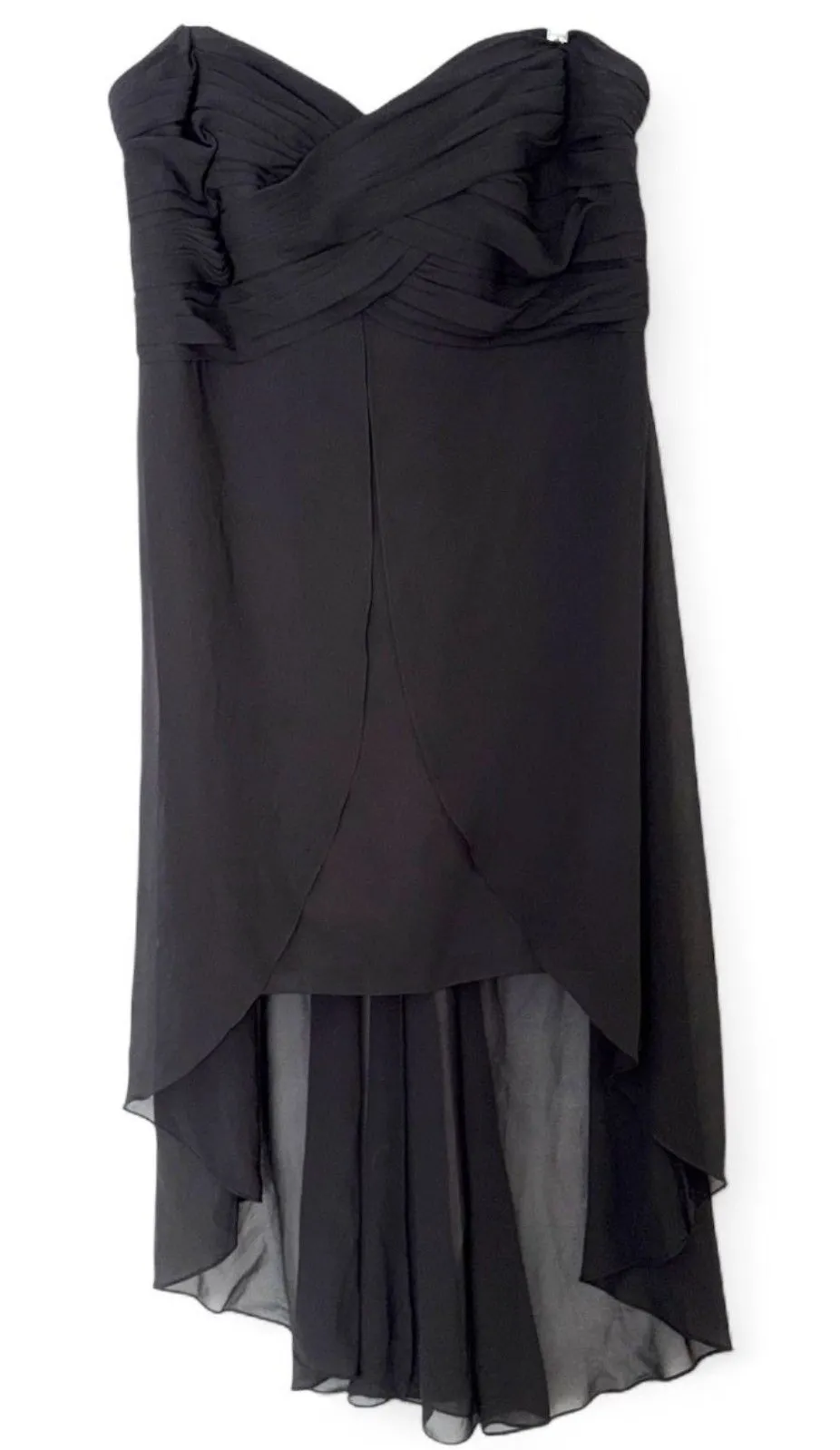 Formal dresses in true plus sizes are hard to find and this bridesmaids dress from David's Bridal is simple, elegant and versatile. The strapless sweetheart neckline with the ruched bust is structured really well--there is boning and a built-in bra. The draping in the front is very flattering and the short skirt is well-balanced by the long, chiffon layer in the back.