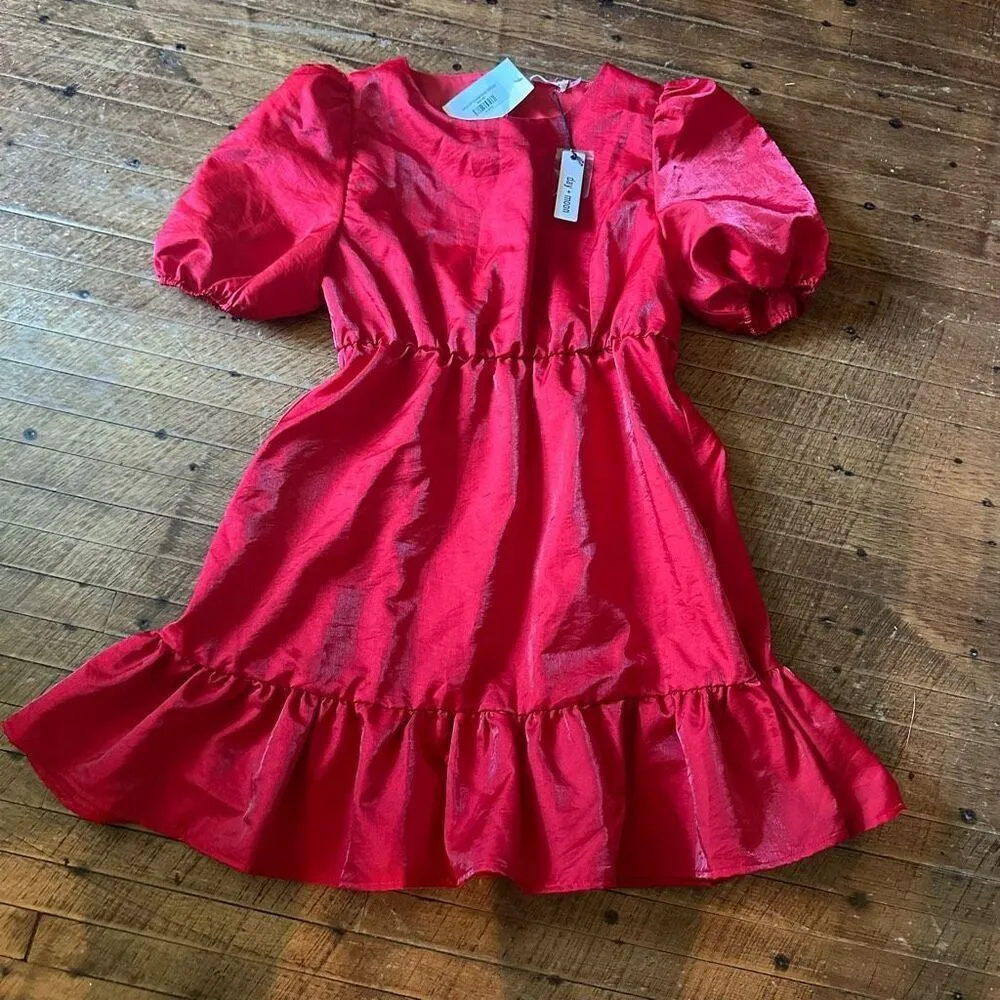 Day + Moon shimmery, ruffled, heart back cutout, ruffled, cherry red, fit and flare, kidcore, night out mini dress. Great date night dress. No stretch. Approximately 18 inches from armpit to armpit, 14 inches across the waist, and 33 inches long. Brand new. From a pet and smoke free house.