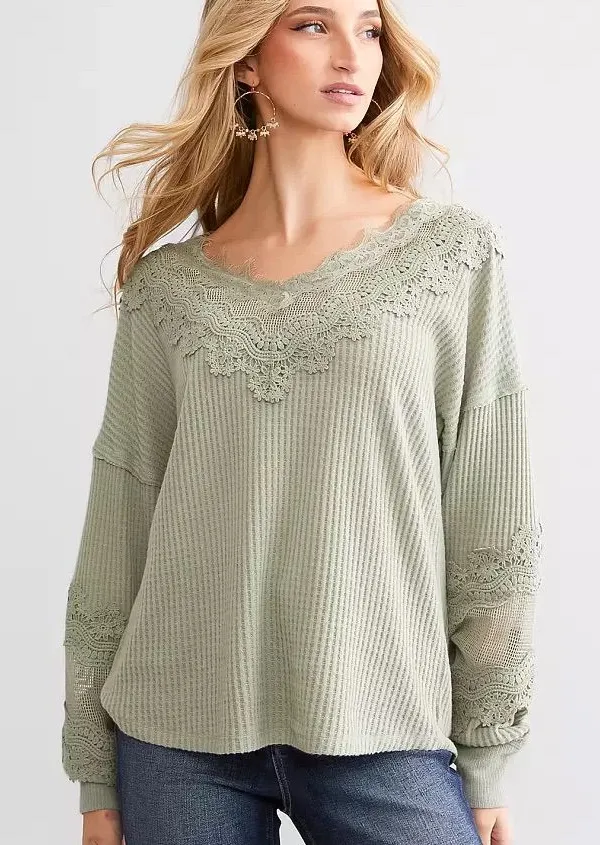 A women's sage green waffle knit long sleeve top from Daytrip with delicate lace trim. This charming... Show more
