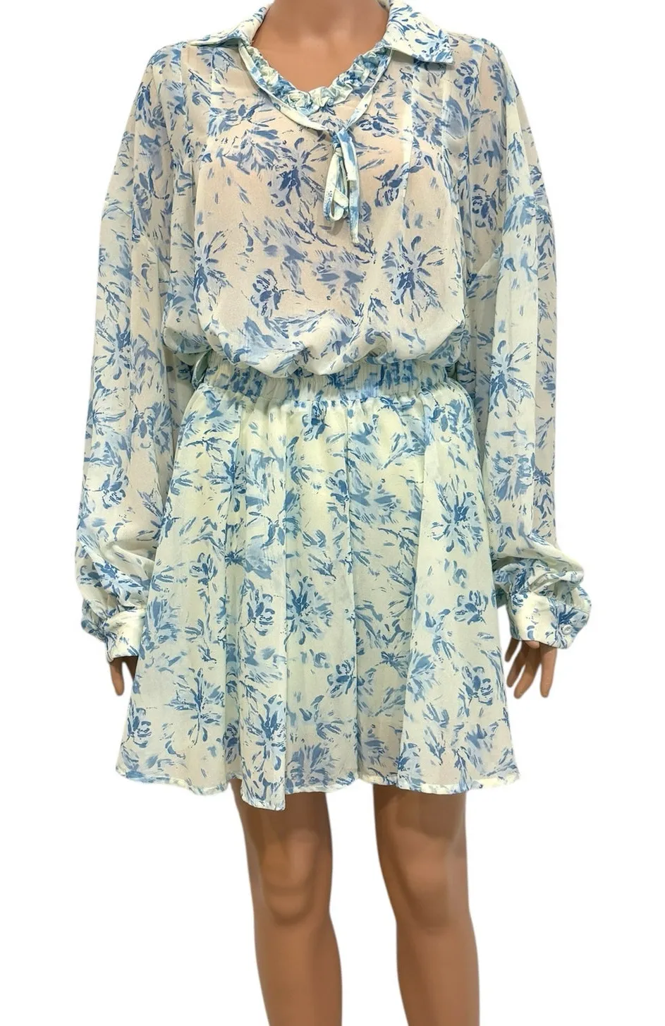women's skirt and ruffle tie front blouse set outfit SK 3115 Brand: Dazy Fabric: lightweight polyester no stretch Condition: new partial tags Size: XL Color: ivory, blue floral print Closure: skirt has elastic waistband, top is pull on Other: top is sheer, shorts are lined vacay beach resort vacation vibes cottage femme fairy prairie print flattering casual pacific boho bohemian gypsy summer spring glam avant garde beachy flattering suit coordinating trendy on trend glam extra large 14 16 flowy wedding bridal party easter church baby shower picnic boat Dazy XL floral skirt and ruffle tie front blouse set outfit SK 3115