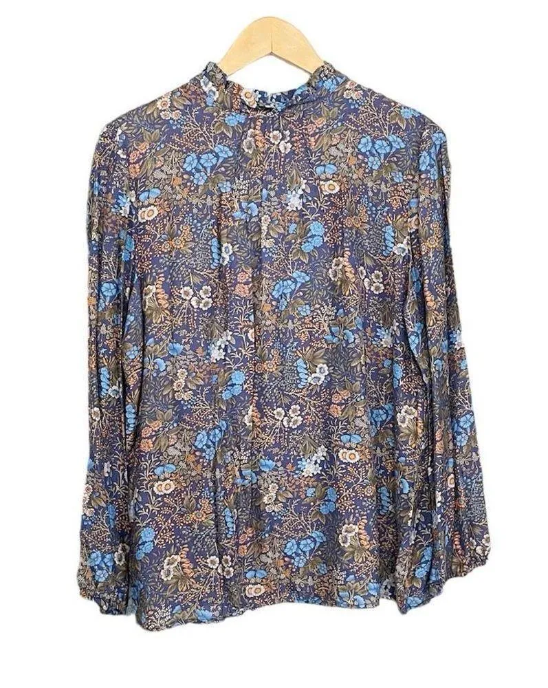 Viola Top by J. McLaughlin in Dark Forest, a blue background with bright blue, green, mustard yellow and off-white floral botanical print. Cottagecore/forestcore style, great to dress up for a special event or to wear to the office. Lightweight blouse with high ruffled stand collar and relaxed silhouette. Sleeves with elastic cuffs. Back keyhole button closure. 73% modal, 27% silk.