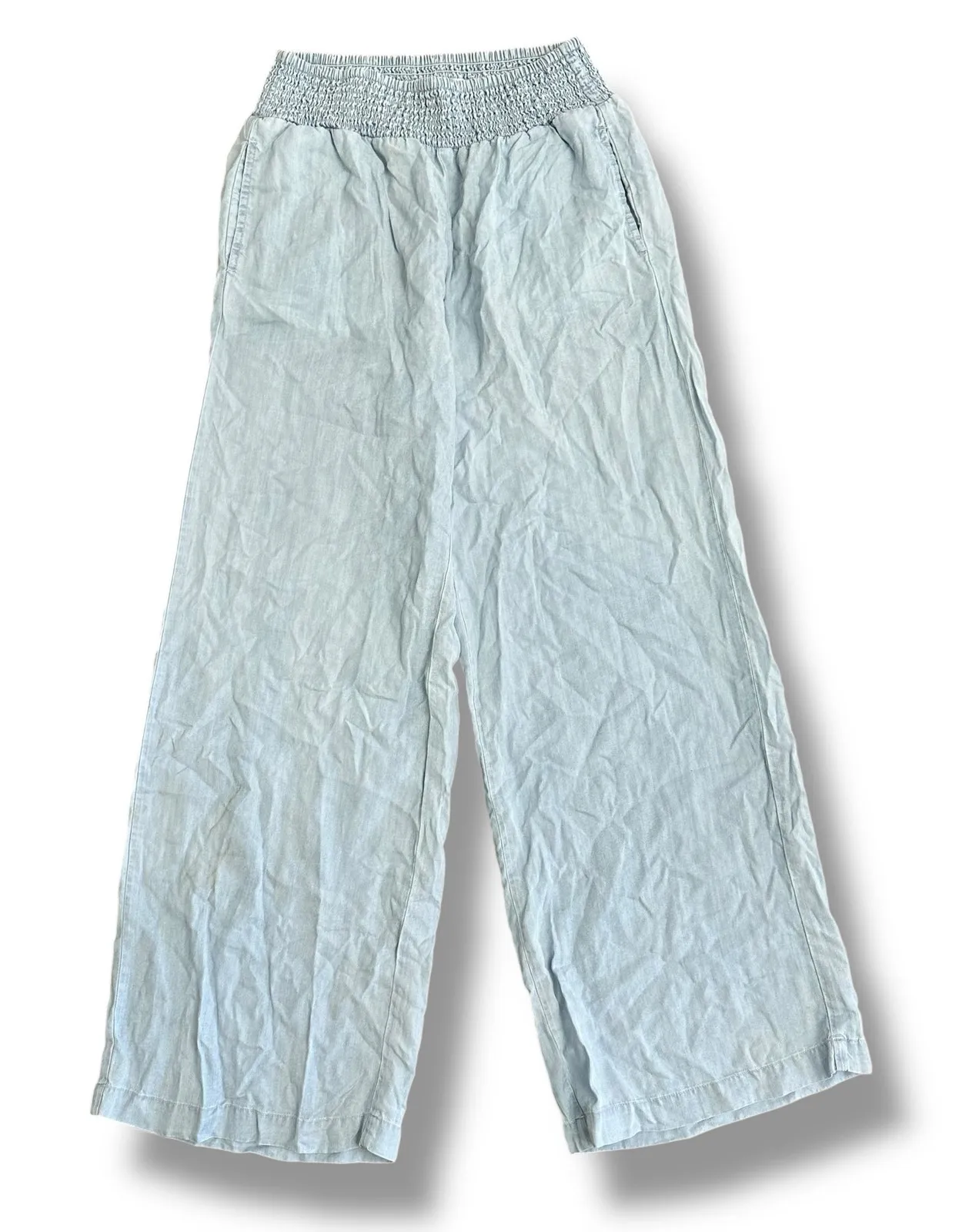 Dear John women’s pants in a size XS. Designed with a wide leg cut and a stretch smocked waistband, these pants offer both comfort and modern style. The light blue shade is versatile and easy to pair with tanks, blouses, or casual tees. Crafted from 100% Tencel, they’re breathable, eco-friendly, and soft against the skin. Featuring side pockets for convenience and an effortless pull-on design, these pants are perfect for warm weather, vacations, or laid-back weekends. • Measurements taken flat (approx.): • Waist: 11.5” (stretches) • Rise: 11” • Inseam: 28.5” • Length: 39.5” • Condition: Excellent pre-owned Original Retail Price: $98 boho chic pants, wide leg summer trousers, sustainable fashion, lightweight resort wear, casual flowy pants