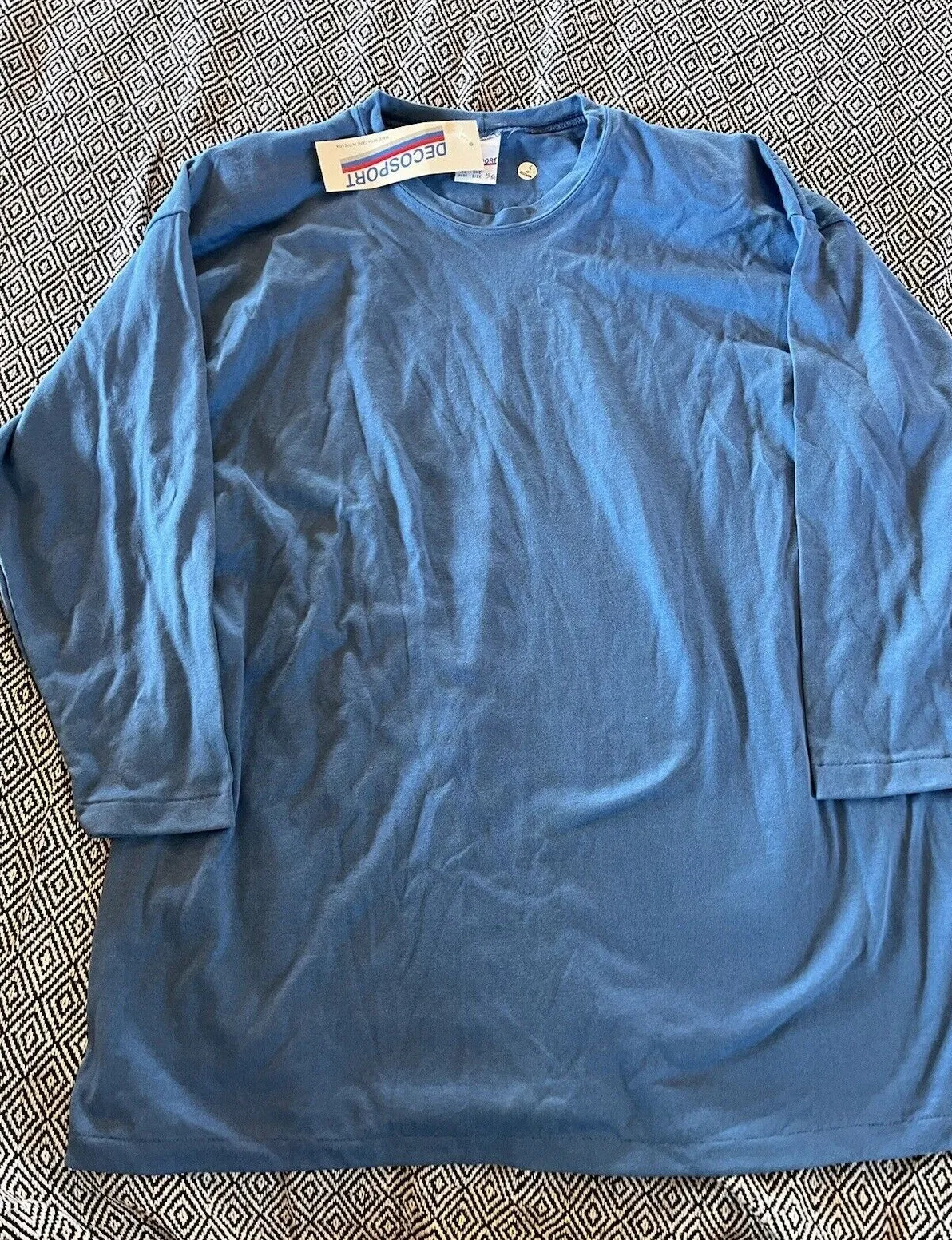 This vintage Decosport T-shirt is a must-have for any 90s fashion enthusiast. The blue color and solid pattern add a touch of nostalgia to your wardrobe. With long sleeves, a crew neckline, and a regular fit, this unisex T-shirt is perfect for any body type. The shoulder pads and unique sleeves really make this piece stand out. Made of cotton material, it is breathable and machine washable for easy care. The shoulder pads and all-season feature make it suitable for any occasion. This T-shirt is a single stitch and has no tags attached. Add it to your collection today! Smoke free and pet friendly home. Thanks for shopping by!