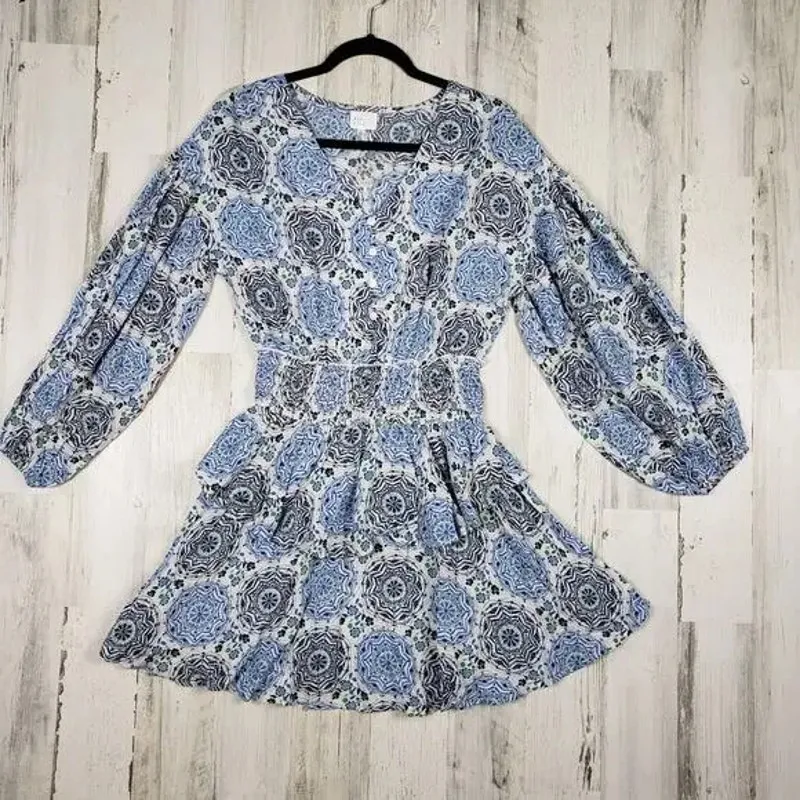 White with blue & green floral print Elastic waist 3/4 balloon sleeves with elastic cuffs Non-functional button accent at chest Lightweight Mini length Pullover Bust: 20" Waist: 12" - 18" Sleeve: 19" Length: 35.5" 100% Rayon AP-1622