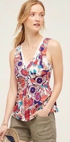 Deletta Anthropologie Amalia Floral Peplum Knit Top This particular top runs a size small. See pit to out measurement below. I’m an 8 Mecium and it’s quite snug and tight. To look like the stock model, it fits a size Small ~ 100% lightweight cotton ~ beautiful vibrant colors. ~ v-neck lined in ivory crepe fabric ~ peplum hem with inverted nearing ~ sleeveless ~ color: Orange Pink ~ excellent condition Size: fits a size S, not a medium, unless you want it really tight Length: 22” Pit to pit: 16.5” (this is a size small measurement) Boho bright layering peasant casual feminine