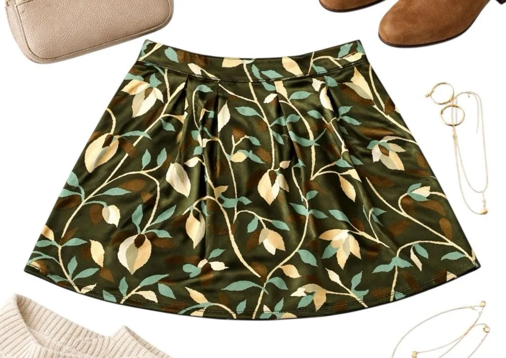 Vintage dELiA*s mini skirt with a smooth satin feel and olive green floral print in muted earth tones. A flattering Jackie-style silhouette with a polished drape that feels elevated while still nodding to Y2K styling. Lightweight with subtle sheen, offering an easy piece to dress up or down. Pairs well with knits, boots, or tailored tops for everyday wear and transitional seasons. Good vintage condition with no noted flaws. Please refer to flat measurements for best fit. Waist: 15” flat Length: 16” #delias #vintageskirt #y2kstyle #miniskirt #quietluxury