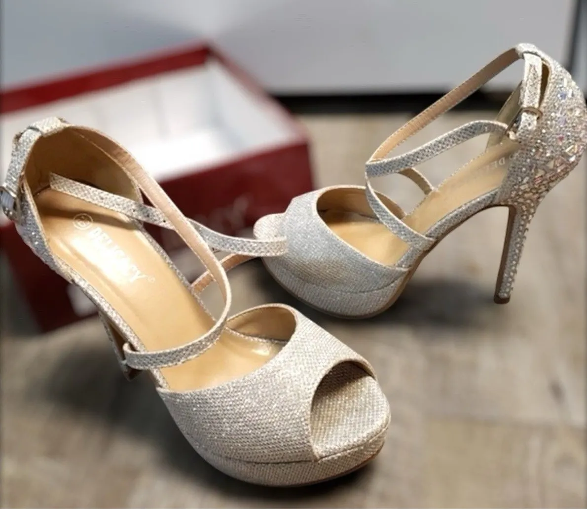 The Delicacy Women's Shoes in size 7.5 feature a stunning silver heel with a platform and silver rhinestone strappy design, making them perfect for various occasions such as travel, weddings, parties, and workwear. With an ultra high stiletto heel and open toe, these heels are sure to add a touch of glamour and elegance to any outfit. The adjustable ankle strap and standard shoe width provide comfort and convenience, while the synthetic upper material ensures durability. Perfect for the summer, fall, and spring seasons, these Delicacy heels are a stylish and chic choice for any fashion-forward woman. Size 7.5 Flaws on inner straps as seen in photos; otherwise beautiful. Stock photo is for fitting purposes. Please note that actual colors may vary slightly from what appears on your screen.