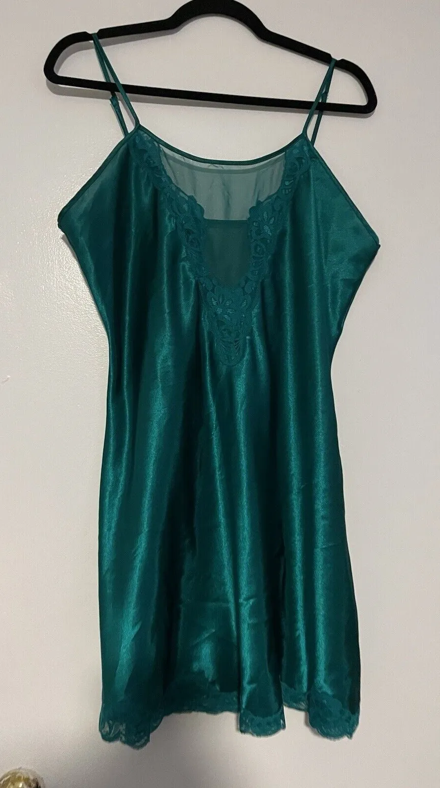 This is a vintage Delicate's emerald green satin and lace negligee slip dress in size L. It features a sleeveless babydoll style with a fairy character design, made of polyester fabric with a lace overlay. The dress has a solid pattern and a 90s theme, suitable for wearing in winter, summer, fall, and spring seasons. CONDITION: Excellent condition, preowned, no visible flaws please see photos for details. ADDITIONAL INFORMATION: -I accept all reasonable offers -Same or next day shipping -Happy Shopping! -Images of items being worn are stock photos to show styling ideas and fit. *Product color may slightly vary due to photographic lighting sources or your monitor settings *No Pet home *Smoke free home *I try my best to provide an accurate description of each item, but may miss something, so please check the pics and description, if you still have any questions, do not hesitate to contact me. *Items may need to be ironed or pressed due to storage, being unwrapped for photos, or creased during shipment.
