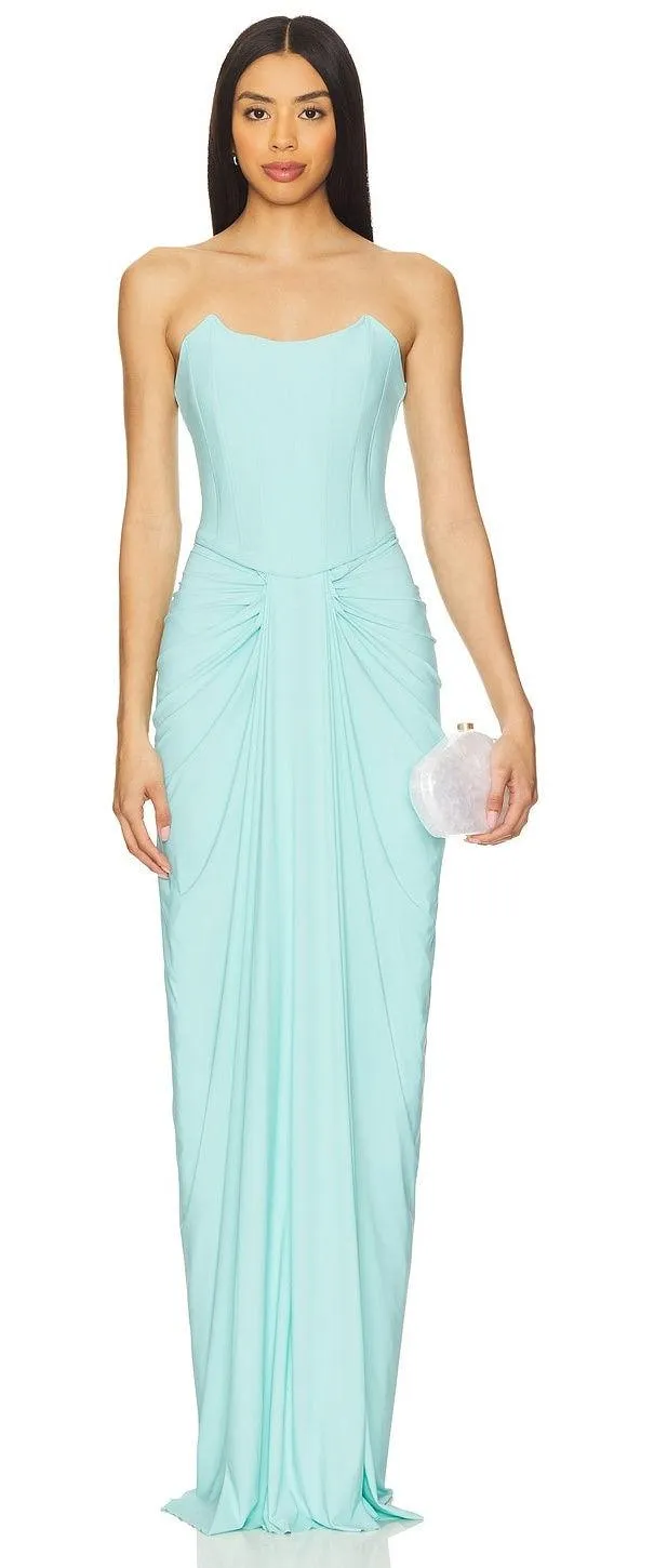 Stunning Deme by Gabriella x REVOLVE dress, perfect for your next special occasion! This ethereal formal dress is brand new with tags (NWT) and ready to make you feel like a goddess. Features: - Color: Pearl Mint - Size: XS - Condition: New with Tags - Collaboration: Deme by Gabriella x REVOLVE - Style: Formal, Ethereal, Goddess 80% nylon, 20% lycra Dry clean only Fully lined Hidden back zip closure Boned bodice Front draped fabric accent Heavyweight slinky jersey fabric Neckline to hem measures approx 60" in length Made in India Original Retail Price: $350.00 Don't miss out on this beautiful dress! It's sure to turn heads and make you feel confident and radiant. Grab it now!